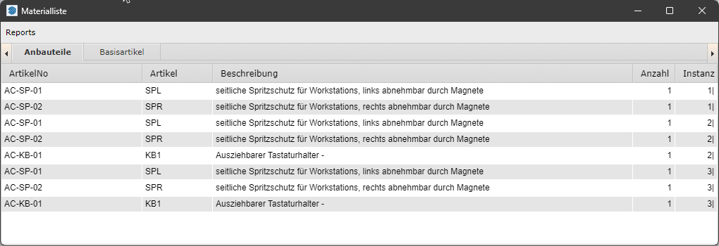 Unter der Registerkarte Basisartikel werden alle Basisartikel separat aufgeführt, auch wenn Basisartikel des gleichen Typs mehrfach vorhanden sind, werden diese nicht aufsummiert, da jeder Basisartikel eine unterschiedliche Konfiguration an Anbauteilen aufweisen kann. Jedem Basisartikel wird eine Instanz-Nummer zugewiesen, um die Anbauteile des jeweiligen Basisartikels zu identifizieren.